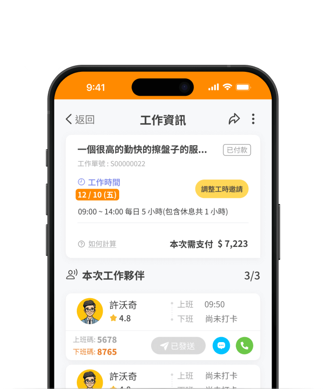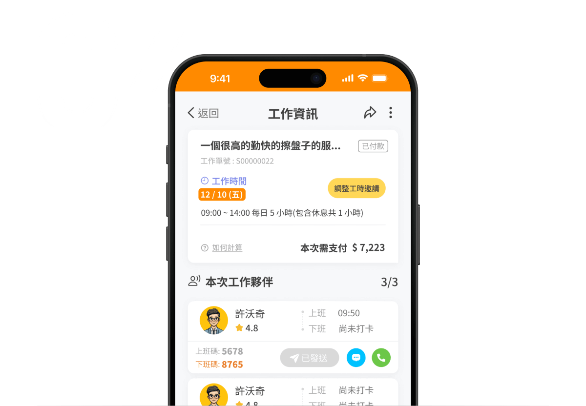 8. 工作日當天,於APP內發送上/下班碼給工作夥伴(下班碼將於夥伴完成上班打卡後顯示)
